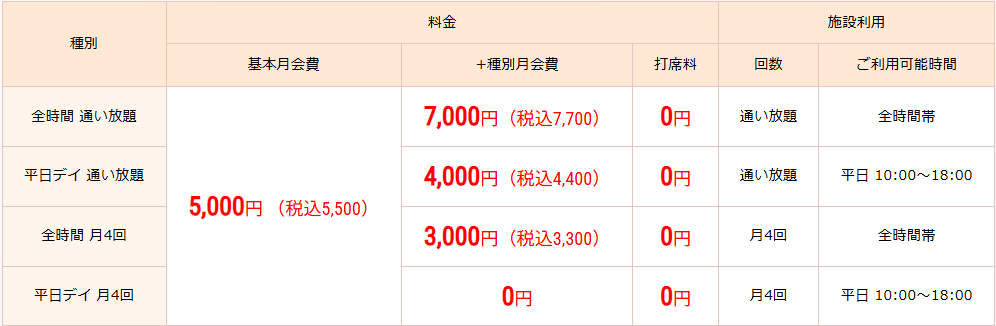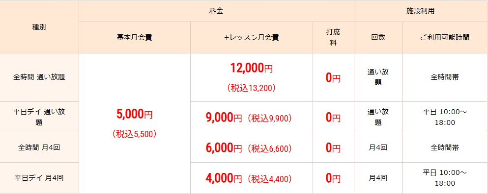 | プラン | 自主練 レッスン併用可 同伴者(最大4名)も無料 |
